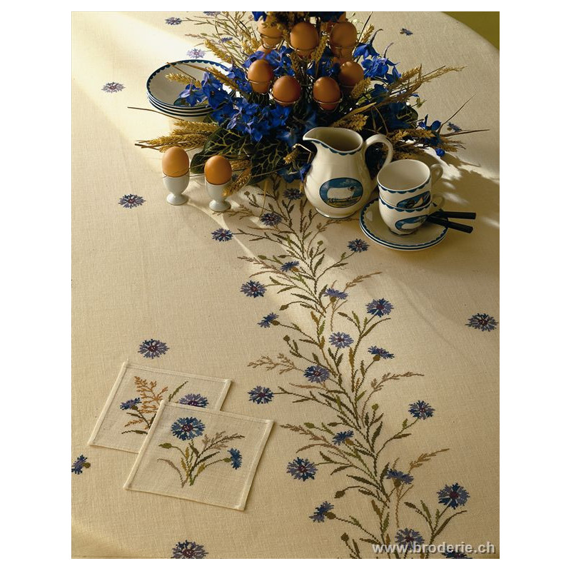 L'article 'Eva Rosenstand, kit Nappe Bleuets (EV12-4091)' fait partie de notre assortiment depuis le 1 mai 2009. Eva Rosenstand est une très belle gamme de points de croix comptés qui fête en 2008 ses 50 ans d'existence. Eva Rosenstand est une des premières maisons à avoir proposé aux clientes un style de broderie qui offrait d'autres motifs que des abécédaires ou marquoirs ... Les créatrices Clara Waever et Eva Rosenstand ont innové en réalisant de véritables tableaux en points de croix comptés, à s'y méprendre à de véritables peintures si on se tient à 1 petit mètre. Vous trouverez dans la gamme Eva Rosenstand beaucoup de paysages, des animaux qui semblent réels et pleins d'autres thèmes (mer - le Cervin - anciens métiers ... cartes de géographie des pays européens). Fiche technique : très belles broderies, riches en teintes différentes, souvent réalisées sur du lin. Points de croix comptés, points arrières. Ces ouvrages ne sont pas difficiles, mais relativement longs - regardez bien le format avant de commander et il est préférable d'aimer travailler sur du lin .. car c'est un peu dommage de devoir changer la trame.