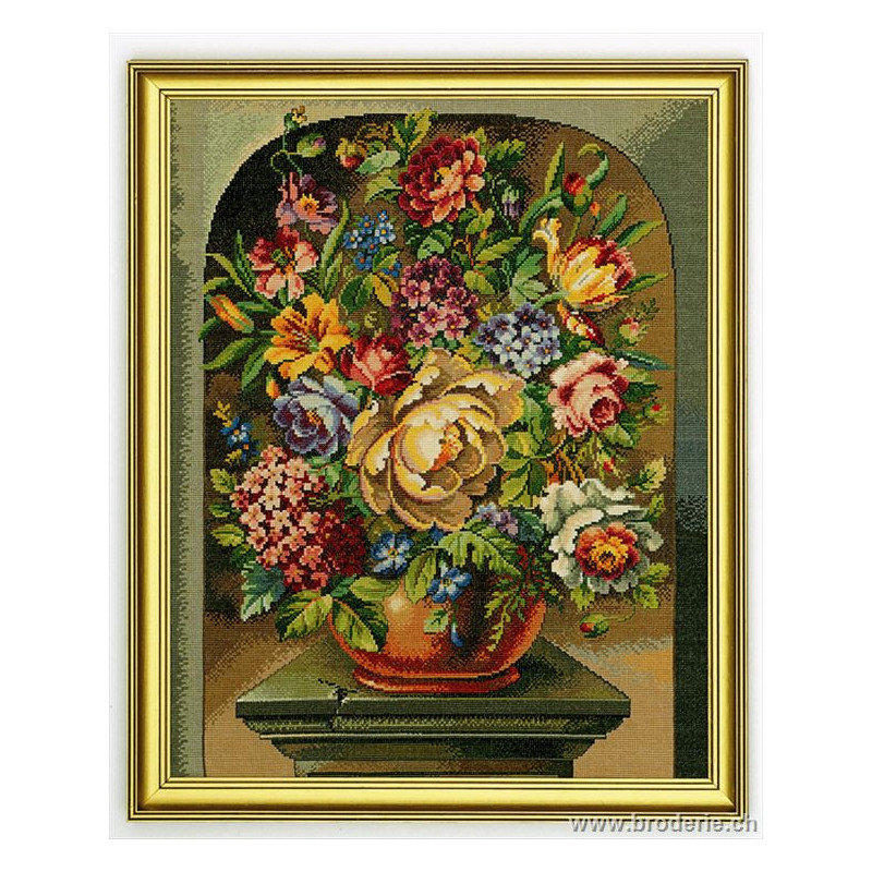 L'article 'Eva Rosenstand, kit Vase à Fleurs 1 (EV12-531)' fait partie de notre assortiment depuis le 1 mai 2009. Eva Rosenstand est une très belle gamme de points de croix comptés qui fête en 2008 ses 50 ans d'existence. Eva Rosenstand est une des premières maisons à avoir proposé aux clientes un style de broderie qui offrait d'autres motifs que des abécédaires ou marquoirs ... Les créatrices Clara Waever et Eva Rosenstand ont innové en réalisant de véritables tableaux en points de croix comptés, à s'y méprendre à de véritables peintures si on se tient à 1 petit mètre. Vous trouverez dans la gamme Eva Rosenstand beaucoup de paysages, des animaux qui semblent réels et pleins d'autres thèmes (mer - le Cervin - anciens métiers ... cartes de géographie des pays européens). Fiche technique : très belles broderies, riches en teintes différentes, souvent réalisées sur du lin. Points de croix comptés, points arrières. Ces ouvrages ne sont pas difficiles, mais relativement longs - regardez bien le format avant de commander et il est préférable d'aimer travailler sur du lin .. car c'est un peu dommage de devoir changer la trame.