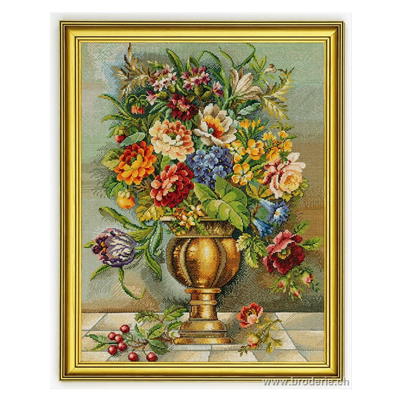 L'article 'Eva Rosenstand, kit Vase à Fleurs 2 (EV12-587)' fait partie de notre assortiment depuis le 1 mai 2009. Eva Rosenstand est une très belle gamme de points de croix comptés qui fête en 2008 ses 50 ans d'existence. Eva Rosenstand est une des premières maisons à avoir proposé aux clientes un style de broderie qui offrait d'autres motifs que des abécédaires ou marquoirs ... Les créatrices Clara Waever et Eva Rosenstand ont innové en réalisant de véritables tableaux en points de croix comptés, à s'y méprendre à de véritables peintures si on se tient à 1 petit mètre. Vous trouverez dans la gamme Eva Rosenstand beaucoup de paysages, des animaux qui semblent réels et pleins d'autres thèmes (mer - le Cervin - anciens métiers ... cartes de géographie des pays européens). Fiche technique : très belles broderies, riches en teintes différentes, souvent réalisées sur du lin. Points de croix comptés, points arrières. Ces ouvrages ne sont pas difficiles, mais relativement longs - regardez bien le format avant de commander et il est préférable d'aimer travailler sur du lin .. car c'est un peu dommage de devoir changer la trame.