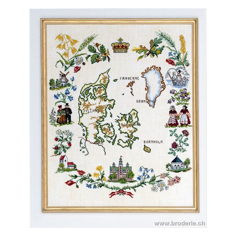 L'article 'Eva Rosenstand, kit Dannemark (EV12-631)' fait partie de notre assortiment depuis le 1 mai 2009. Eva Rosenstand est une très belle gamme de points de croix comptés qui fête en 2008 ses 50 ans d'existence. Eva Rosenstand est une des premières maisons à avoir proposé aux clientes un style de broderie qui offrait d'autres motifs que des abécédaires ou marquoirs ... Les créatrices Clara Waever et Eva Rosenstand ont innové en réalisant de véritables tableaux en points de croix comptés, à s'y méprendre à de véritables peintures si on se tient à 1 petit mètre. Vous trouverez dans la gamme Eva Rosenstand beaucoup de paysages, des animaux qui semblent réels et pleins d'autres thèmes (mer - le Cervin - anciens métiers ... cartes de géographie des pays européens). Fiche technique : très belles broderies, riches en teintes différentes, souvent réalisées sur du lin. Points de croix comptés, points arrières. Ces ouvrages ne sont pas difficiles, mais relativement longs - regardez bien le format avant de commander et il est préférable d'aimer travailler sur du lin .. car c'est un peu dommage de devoir changer la trame.