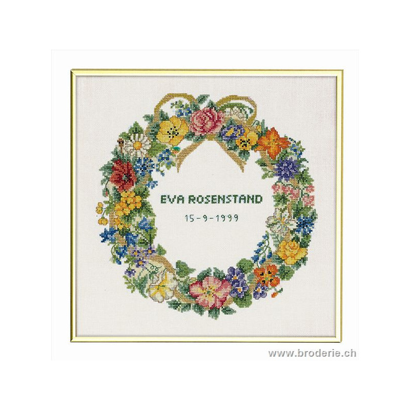 L'article 'Eva Rosenstand, kit Couronne de fleurs (EV12-678)' fait partie de notre assortiment depuis le 1 mai 2009. Eva Rosenstand est une très belle gamme de points de croix comptés qui fête en 2008 ses 50 ans d'existence. Eva Rosenstand est une des premières maisons à avoir proposé aux clientes un style de broderie qui offrait d'autres motifs que des abécédaires ou marquoirs ... Les créatrices Clara Waever et Eva Rosenstand ont innové en réalisant de véritables tableaux en points de croix comptés, à s'y méprendre à de véritables peintures si on se tient à 1 petit mètre. Vous trouverez dans la gamme Eva Rosenstand beaucoup de paysages, des animaux qui semblent réels et pleins d'autres thèmes (mer - le Cervin - anciens métiers ... cartes de géographie des pays européens). Fiche technique : très belles broderies, riches en teintes différentes, souvent réalisées sur du lin. Points de croix comptés, points arrières. Ces ouvrages ne sont pas difficiles, mais relativement longs - regardez bien le format avant de commander et il est préférable d'aimer travailler sur du lin .. car c'est un peu dommage de devoir changer la trame.