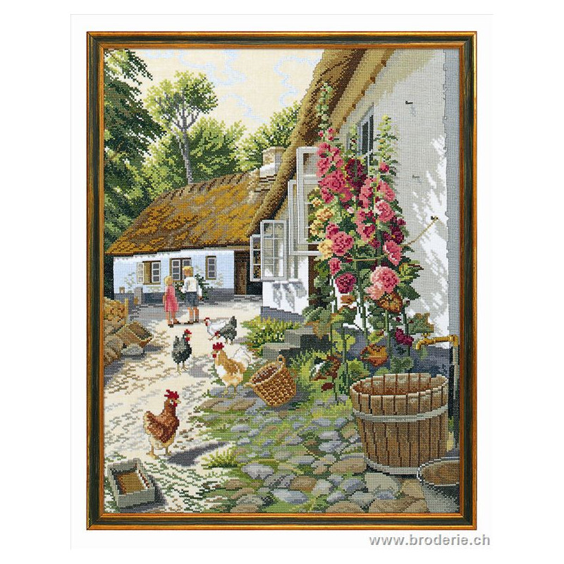 L'article 'Eva Rosenstand, kit Maison ferme (EV12-710)' fait partie de notre assortiment depuis le 1 mai 2009. Eva Rosenstand est une très belle gamme de points de croix comptés qui fête en 2008 ses 50 ans d'existence. Eva Rosenstand est une des premières maisons à avoir proposé aux clientes un style de broderie qui offrait d'autres motifs que des abécédaires ou marquoirs ... Les créatrices Clara Waever et Eva Rosenstand ont innové en réalisant de véritables tableaux en points de croix comptés, à s'y méprendre à de véritables peintures si on se tient à 1 petit mètre. Vous trouverez dans la gamme Eva Rosenstand beaucoup de paysages, des animaux qui semblent réels et pleins d'autres thèmes (mer - le Cervin - anciens métiers ... cartes de géographie des pays européens). Fiche technique : très belles broderies, riches en teintes différentes, souvent réalisées sur du lin. Points de croix comptés, points arrières. Ces ouvrages ne sont pas difficiles, mais relativement longs - regardez bien le format avant de commander et il est préférable d'aimer travailler sur du lin .. car c'est un peu dommage de devoir changer la trame.