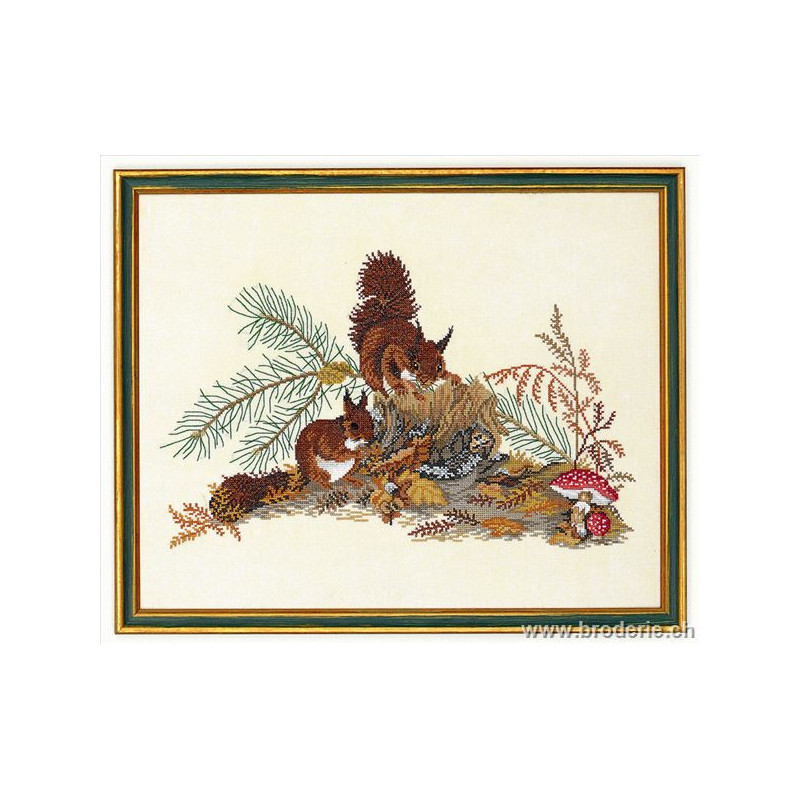 L'article 'Eva Rosenstand, kit Ecureuils (EV12-826)' fait partie de notre assortiment depuis le 1 mai 2009. Eva Rosenstand est une très belle gamme de points de croix comptés qui fête en 2008 ses 50 ans d'existence. Eva Rosenstand est une des premières maisons à avoir proposé aux clientes un style de broderie qui offrait d'autres motifs que des abécédaires ou marquoirs ... Les créatrices Clara Waever et Eva Rosenstand ont innové en réalisant de véritables tableaux en points de croix comptés, à s'y méprendre à de véritables peintures si on se tient à 1 petit mètre. Vous trouverez dans la gamme Eva Rosenstand beaucoup de paysages, des animaux qui semblent réels et pleins d'autres thèmes (mer - le Cervin - anciens métiers ... cartes de géographie des pays européens). Fiche technique : très belles broderies, riches en teintes différentes, souvent réalisées sur du lin. Points de croix comptés, points arrières. Ces ouvrages ne sont pas difficiles, mais relativement longs - regardez bien le format avant de commander et il est préférable d'aimer travailler sur du lin .. car c'est un peu dommage de devoir changer la trame.