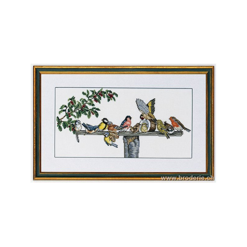 L'article 'Eva Rosenstand, kit Oiseaux et mangeoire (EV14-076)' fait partie de notre assortiment depuis le 1 mai 2009. Eva Rosenstand est une très belle gamme de points de croix comptés qui fête en 2008 ses 50 ans d'existence. Eva Rosenstand est une des premières maisons à avoir proposé aux clientes un style de broderie qui offrait d'autres motifs que des abécédaires ou marquoirs ... Les créatrices Clara Waever et Eva Rosenstand ont innové en réalisant de véritables tableaux en points de croix comptés, à s'y méprendre à de véritables peintures si on se tient à 1 petit mètre. Vous trouverez dans la gamme Eva Rosenstand beaucoup de paysages, des animaux qui semblent réels et pleins d'autres thèmes (mer - le Cervin - anciens métiers ... cartes de géographie des pays européens). Fiche technique : très belles broderies, riches en teintes différentes, souvent réalisées sur du lin. Points de croix comptés, points arrières. Ces ouvrages ne sont pas difficiles, mais relativement longs - regardez bien le format avant de commander et il est préférable d'aimer travailler sur du lin .. car c'est un peu dommage de devoir changer la trame.