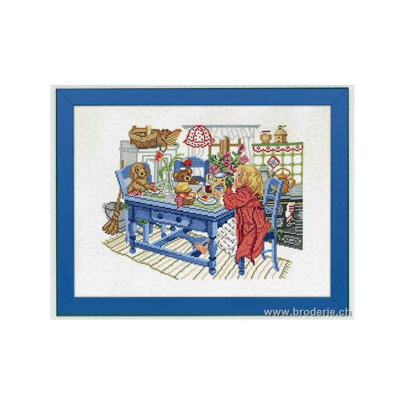 L'article 'Eva Rosenstand, kit Le goûter (EV14-101)' fait partie de notre assortiment depuis le 1 mai 2009. Eva Rosenstand est une très belle gamme de points de croix comptés qui fête en 2008 ses 50 ans d'existence. Eva Rosenstand est une des premières maisons à avoir proposé aux clientes un style de broderie qui offrait d'autres motifs que des abécédaires ou marquoirs ... Les créatrices Clara Waever et Eva Rosenstand ont innové en réalisant de véritables tableaux en points de croix comptés, à s'y méprendre à de véritables peintures si on se tient à 1 petit mètre. Vous trouverez dans la gamme Eva Rosenstand beaucoup de paysages, des animaux qui semblent réels et pleins d'autres thèmes (mer - le Cervin - anciens métiers ... cartes de géographie des pays européens). Fiche technique : très belles broderies, riches en teintes différentes, souvent réalisées sur du lin. Points de croix comptés, points arrières. Ces ouvrages ne sont pas difficiles, mais relativement longs - regardez bien le format avant de commander et il est préférable d'aimer travailler sur du lin .. car c'est un peu dommage de devoir changer la trame.