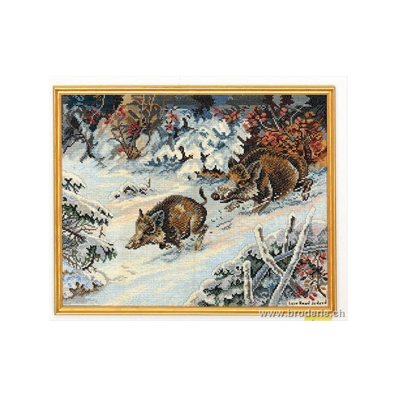 L'article 'Eva Rosenstand, kit Sangliers (EV14-203)' fait partie de notre assortiment depuis le 1 mai 2009. Eva Rosenstand est une très belle gamme de points de croix comptés qui fête en 2008 ses 50 ans d'existence. Eva Rosenstand est une des premières maisons à avoir proposé aux clientes un style de broderie qui offrait d'autres motifs que des abécédaires ou marquoirs ... Les créatrices Clara Waever et Eva Rosenstand ont innové en réalisant de véritables tableaux en points de croix comptés, à s'y méprendre à de véritables peintures si on se tient à 1 petit mètre. Vous trouverez dans la gamme Eva Rosenstand beaucoup de paysages, des animaux qui semblent réels et pleins d'autres thèmes (mer - le Cervin - anciens métiers ... cartes de géographie des pays européens). Fiche technique : très belles broderies, riches en teintes différentes, souvent réalisées sur du lin. Points de croix comptés, points arrières. Ces ouvrages ne sont pas difficiles, mais relativement longs - regardez bien le format avant de commander et il est préférable d'aimer travailler sur du lin .. car c'est un peu dommage de devoir changer la trame.