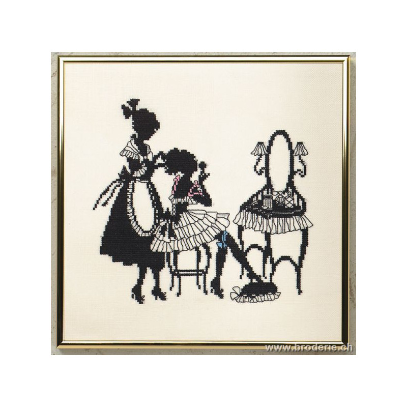 L'article 'Eva Rosenstand, kit Silhouette coiffeuse (EV14-271)' fait partie de notre assortiment depuis le 1 mai 2009. Eva Rosenstand est une très belle gamme de points de croix comptés qui fête en 2008 ses 50 ans d'existence. Eva Rosenstand est une des premières maisons à avoir proposé aux clientes un style de broderie qui offrait d'autres motifs que des abécédaires ou marquoirs ... Les créatrices Clara Waever et Eva Rosenstand ont innové en réalisant de véritables tableaux en points de croix comptés, à s'y méprendre à de véritables peintures si on se tient à 1 petit mètre. Vous trouverez dans la gamme Eva Rosenstand beaucoup de paysages, des animaux qui semblent réels et pleins d'autres thèmes (mer - le Cervin - anciens métiers ... cartes de géographie des pays européens). Fiche technique : très belles broderies, riches en teintes différentes, souvent réalisées sur du lin. Points de croix comptés, points arrières. Ces ouvrages ne sont pas difficiles, mais relativement longs - regardez bien le format avant de commander et il est préférable d'aimer travailler sur du lin .. car c'est un peu dommage de devoir changer la trame.