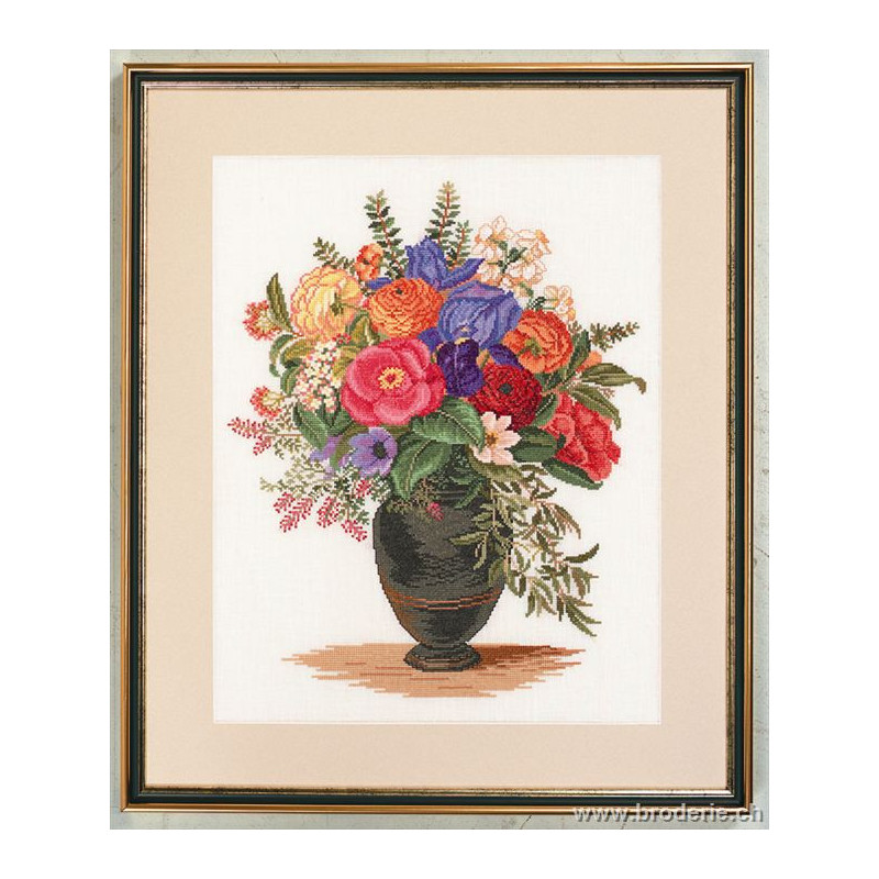 L'article 'Eva Rosenstand, kit Symphonie de fleurs (EV14-276)' fait partie de notre assortiment depuis le 1 mai 2009. Eva Rosenstand est une très belle gamme de points de croix comptés qui fête en 2008 ses 50 ans d'existence. Eva Rosenstand est une des premières maisons à avoir proposé aux clientes un style de broderie qui offrait d'autres motifs que des abécédaires ou marquoirs ... Les créatrices Clara Waever et Eva Rosenstand ont innové en réalisant de véritables tableaux en points de croix comptés, à s'y méprendre à de véritables peintures si on se tient à 1 petit mètre. Vous trouverez dans la gamme Eva Rosenstand beaucoup de paysages, des animaux qui semblent réels et pleins d'autres thèmes (mer - le Cervin - anciens métiers ... cartes de géographie des pays européens). Fiche technique : très belles broderies, riches en teintes différentes, souvent réalisées sur du lin. Points de croix comptés, points arrières. Ces ouvrages ne sont pas difficiles, mais relativement longs - regardez bien le format avant de commander et il est préférable d'aimer travailler sur du lin .. car c'est un peu dommage de devoir changer la trame.