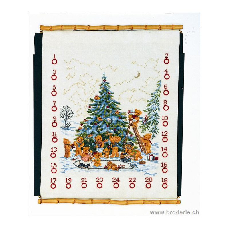 L'article 'Eva Rosenstand, kit Calendrier de l'Avent Ours (EV15-258)' fait partie de notre assortiment depuis le 1 mai 2009. Eva Rosenstand est une très belle gamme de points de croix comptés qui fête en 2008 ses 50 ans d'existence. Eva Rosenstand est une des premières maisons à avoir proposé aux clientes un style de broderie qui offrait d'autres motifs que des abécédaires ou marquoirs ... Les créatrices Clara Waever et Eva Rosenstand ont innové en réalisant de véritables tableaux en points de croix comptés, à s'y méprendre à de véritables peintures si on se tient à 1 petit mètre. Vous trouverez dans la gamme Eva Rosenstand beaucoup de paysages, des animaux qui semblent réels et pleins d'autres thèmes (mer - le Cervin - anciens métiers ... cartes de géographie des pays européens). Fiche technique : très belles broderies, riches en teintes différentes, souvent réalisées sur du lin. Points de croix comptés, points arrières. Ces ouvrages ne sont pas difficiles, mais relativement longs - regardez bien le format avant de commander et il est préférable d'aimer travailler sur du lin .. car c'est un peu dommage de devoir changer la trame.