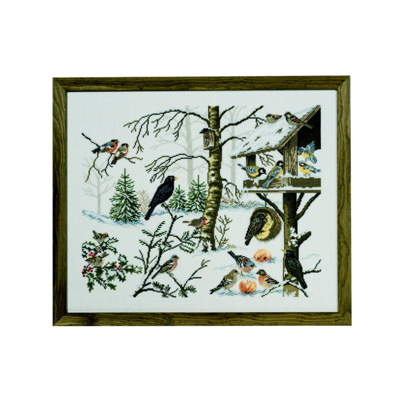 L'article 'Eva Rosenstand, kit oiseaux en hiver (EV12-651)' fait partie de notre assortiment depuis le 5 mai 2010. Eva Rosenstand est une très belle gamme de points de croix comptés qui fête en 2008 ses 50 ans d'existence. Eva Rosenstand est une des premières maisons à avoir proposé aux clientes un style de broderie qui offrait d'autres motifs que des abécédaires ou marquoirs ... Les créatrices Clara Waever et Eva Rosenstand ont innové en réalisant de véritables tableaux en points de croix comptés, à s'y méprendre à de véritables peintures si on se tient à 1 petit mètre. Vous trouverez dans la gamme Eva Rosenstand beaucoup de paysages, des animaux qui semblent réels et pleins d'autres thèmes (mer - le Cervin - anciens métiers ... cartes de géographie des pays européens). Fiche technique : très belles broderies, riches en teintes différentes, souvent réalisées sur du lin. Points de croix comptés, points arrières. Ces ouvrages ne sont pas difficiles, mais relativement longs - regardez bien le format avant de commander et il est préférable d'aimer travailler sur du lin .. car c'est un peu dommage de devoir changer la trame.