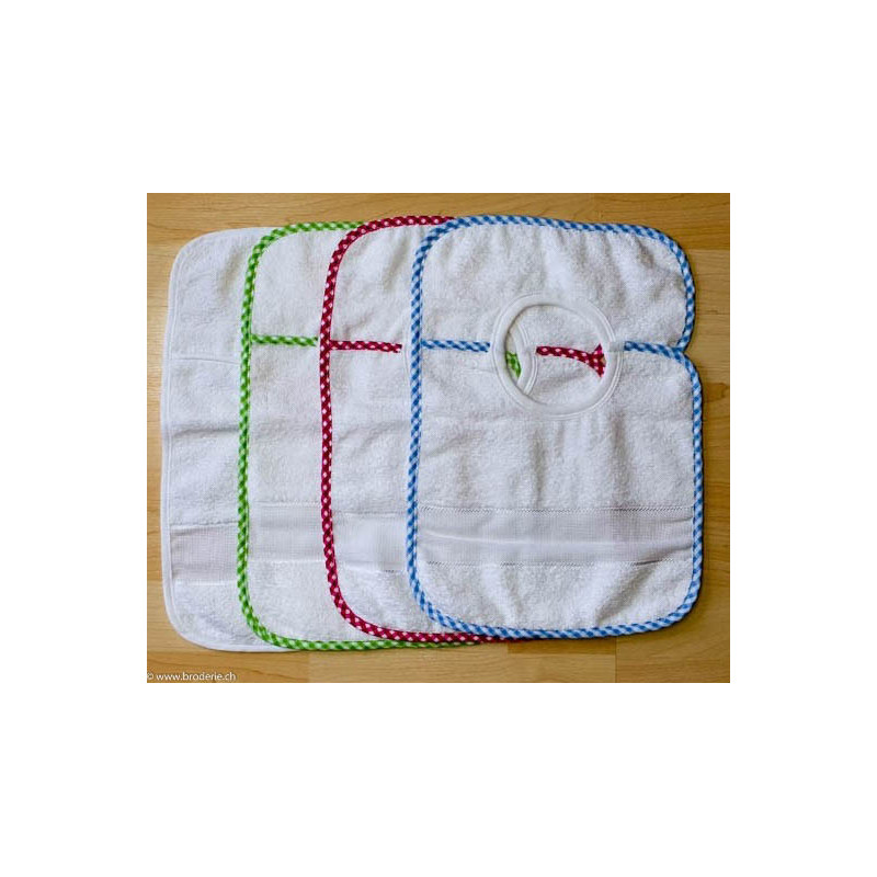 La Chiocciolina, Bavoir avec velcro bord vichy vert (art. BV00127V). Dimensions: 28 x 25 cm. En éponge, avec bande à broder aïda 6 points/cm de 30 points de haut, 2ème à gauche sur la photo.