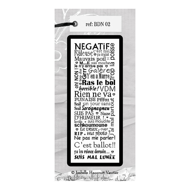 L'article 'Isabelle Vautier, grille Négatif (BDN02)' fait partie de notre assortiment depuis le 6 juin 2013. Isabelle Vautier nous propose une très jolie gamme de modèles de points de croix comptés, faciles à réaliser sur des thèmes toujours actuels - aminaux, abécédaire, fleurs marquoir, coeurs. Ces modèles sont très agréables à réaliser, et Isabelle propose aussi de sympathiques monochromes, éventuellement deux teintes. Fiche technique : points de croix, peu de points arrières.