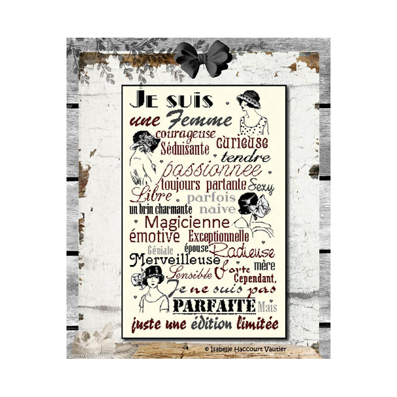 L'article 'Isabelle Vautier, grille je suis une femme .... (BDN37)' fait partie de notre assortiment depuis le 10 mai 2018. Isabelle Vautier nous propose une très jolie gamme de modèles de points de croix comptés, faciles à réaliser sur des thèmes toujours actuels - aminaux, abécédaire, fleurs marquoir, coeurs. Ces modèles sont très agréables à réaliser, et Isabelle propose aussi de sympathiques monochromes, éventuellement deux teintes. Fiche technique : points de croix, peu de points arrières.