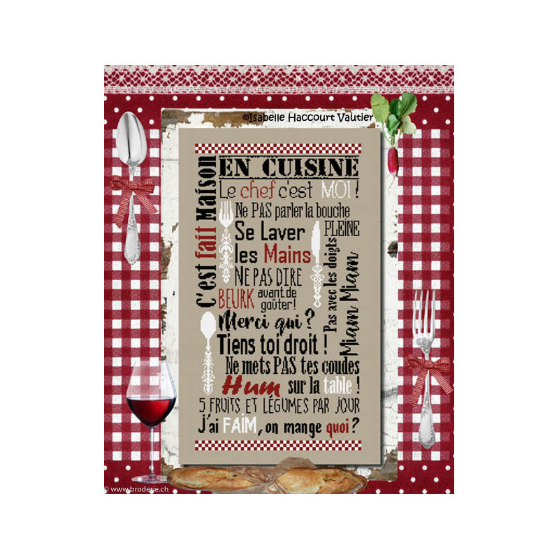 L'article 'Isabelle Vautier, grille En cuisine (BDN50)' fait partie de notre assortiment depuis le 27 mars 2019. Isabelle Vautier nous propose une très jolie gamme de modèles de points de croix comptés, faciles à réaliser sur des thèmes toujours actuels - aminaux, abécédaire, fleurs marquoir, coeurs. Ces modèles sont très agréables à réaliser, et Isabelle propose aussi de sympathiques monochromes, éventuellement deux teintes. Fiche technique : points de croix, peu de points arrières.
