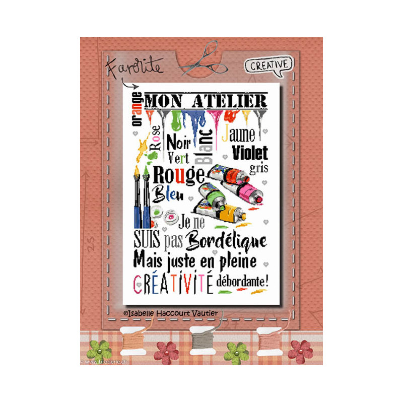 L'article 'Isabelle Vautier, grille Dans mon atelier (BDN56)' fait partie de notre assortiment depuis le 31 août 2019. Isabelle Vautier nous propose une très jolie gamme de modèles de points de croix comptés, faciles à réaliser sur des thèmes toujours actuels - aminaux, abécédaire, fleurs marquoir, coeurs. Ces modèles sont très agréables à réaliser, et Isabelle propose aussi de sympathiques monochromes, éventuellement deux teintes. Fiche technique : points de croix, peu de points arrières.
