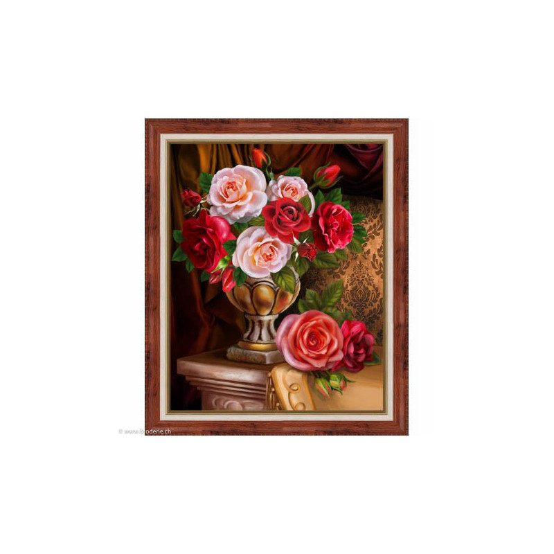 Artibalta, kit diamant Noble roses (art. AZ-1731). Dimensions: 40 x 30 cm. Kit comprenant la toile adhésive, les strass carrés emballés dans des sachets individuels et numérotés aux références des coloris de DMC, une pince, un stylo et sa colle, 2 réceptables et les explications.Toute la surface du tableau est à recouvrir de strass. ATTENTION: ce n'est pas une broderie, il n'y a ni fil ni aiguille, mais un collage comme une mosaïque.