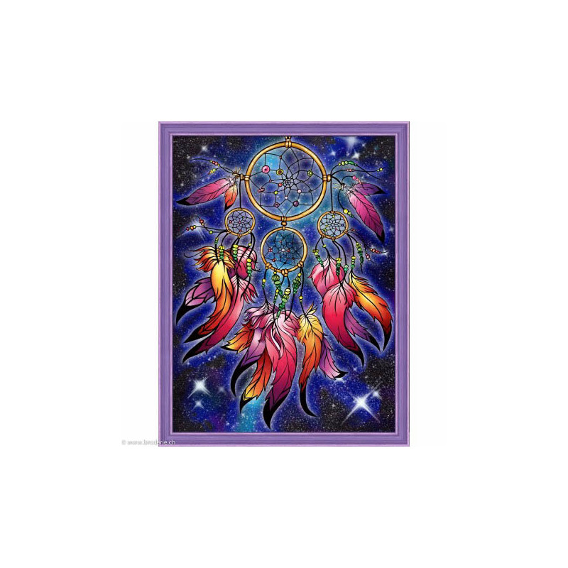 Artibalta, kit diamant Magical Dreamcatcher (art. AZ-1764). Dimensions: 40 x 30 cm. Kit comprenant la toile adhésive, les strass carrés emballés dans des sachets individuels et numérotés aux références des coloris de DMC, une pince, un stylo et sa colle, 2 réceptables et les explications.Toute la surface du tableau est à recouvrir de strass. ATTENTION: ce n'est pas une broderie, il n'y a ni fil ni aiguille, mais un collage comme une mosaïque.