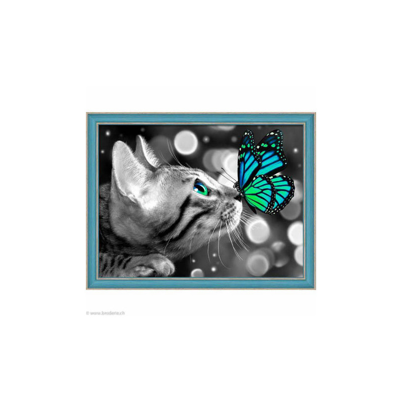 Artibalta, kit diamant Bengal Cat and Butterfly (art. AZ-1789). Dimensions: 40 x 30 cm. Kit comprenant la toile adhésive, les strass carrés emballés dans des sachets individuels et numérotés aux références des coloris de DMC, une pince, un stylo et sa colle, 2 réceptables et les explications.Toute la surface du tableau est à recouvrir de strass. ATTENTION: ce n'est pas une broderie, il n'y a ni fil ni aiguille, mais un collage comme une mosaïque.