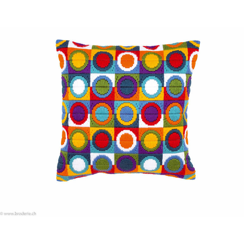 Vervaco, kit coussin géométrie (art. PN0021380). Dimensions: 40 x 40 cm. Canevas peint points lancés, n'est pas vendu hors de Suisse. Dans la même série PN0010865, PN0010867, PN0010866, PN0150843, PN0156326. Le fond pour la confection du coussin n'est pas fourni avec.