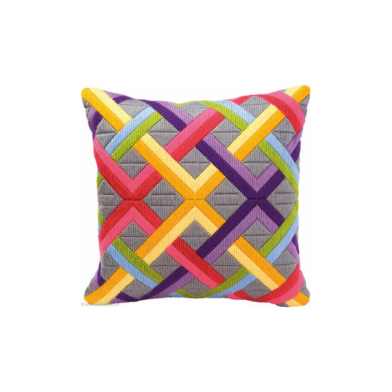 Vervaco, kit coussin géométrie (art. PN0010865). Dimensions: 40 x 40 cm. Canevas peint points lancés, n'est pas vendu hors de Suisse. Dans la même série PN0021380, PN0010867, PN0010866, PN0150843, PN0156326. Le fond pour la confection du coussin n'est pas fourni avec.