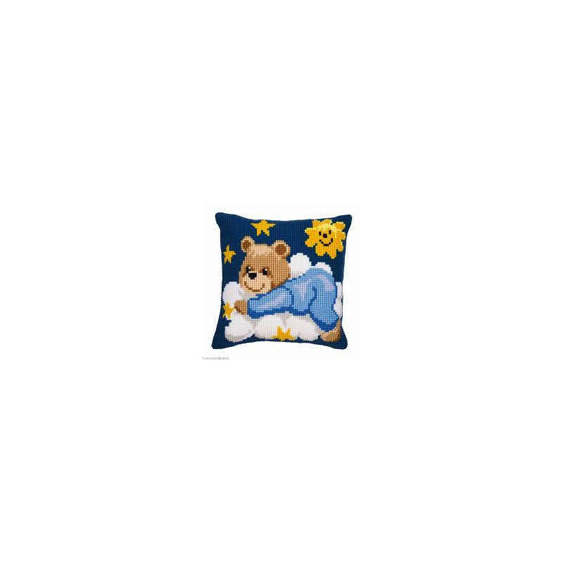 Vervaco, kit coussin Ours bleu sur un nuage (art. PN0008573). Dimensions: 40 x 40 cm. Points utilisés: point de croix. Canevas peint 1,8 croix/cm, le fond n'est pas fourni pour le montage, n'est pas vendu hors de Suisse, dans la même série PN0008574.
