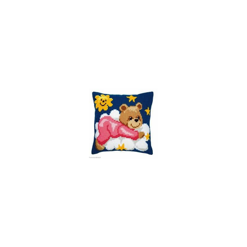 Vervaco, kit coussin Ours rose sur un nuage (art. PN0008574). Dimensions: 40 x 40 cm. Points utilisés: point de croix. Canevas peint 1,8 croix/cm, le fond n'est pas fourni pour le montage, n'est pas vendu hors de Suisse, dans la même série PN0008573.