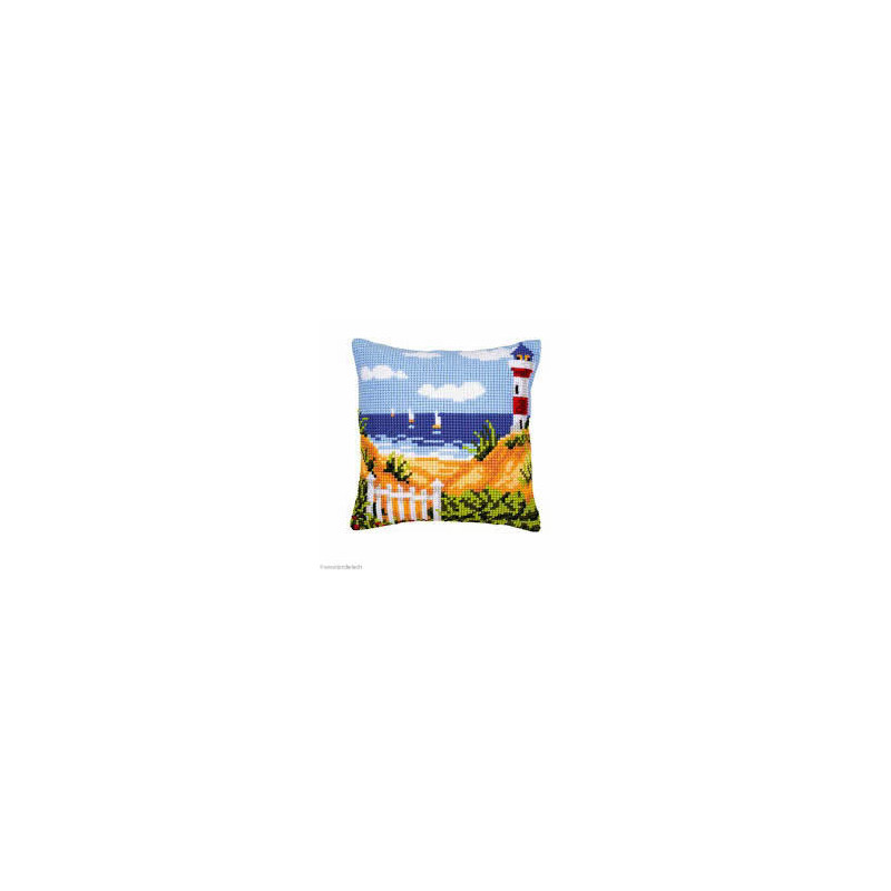 Vervaco, kit coussin La plage au phare (art. PN0008731). Dimensions: 40 x 40 cm. Points utilisés: point de croix. Canevas peint 1,8 croix/cm, le fond n'est pas fourni pour le montage, n'est pas vendu hors de Suisse.