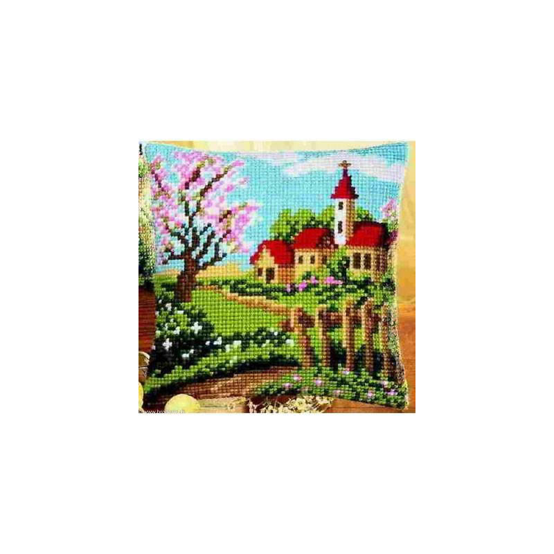 Vervaco, kit coussin Printemps au village (art. PN0008732). Dimensions: 40 x 40 cm. Points utilisés: point de croix. Canevas peint 1,8 croix/cm, le fond n'est pas fourni pour le montage, n'est pas vendu hors de Suisse.