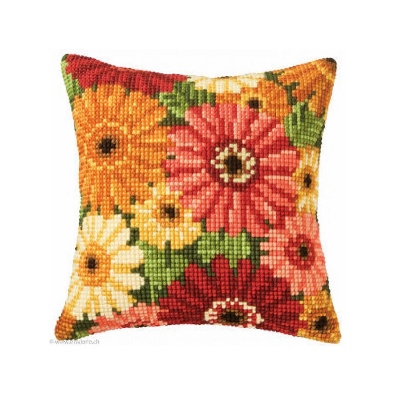 Vervaco, kit coussin au point de croix Fleurs d'été (art. PN0008796). Dimensions: 40 x 40 cm. Points utilisés: point de croix. Canevas peint 1.8 croix/cm, le fond n'est pas fourni pour le montage, n'est pas vendu hors de Suisse.
