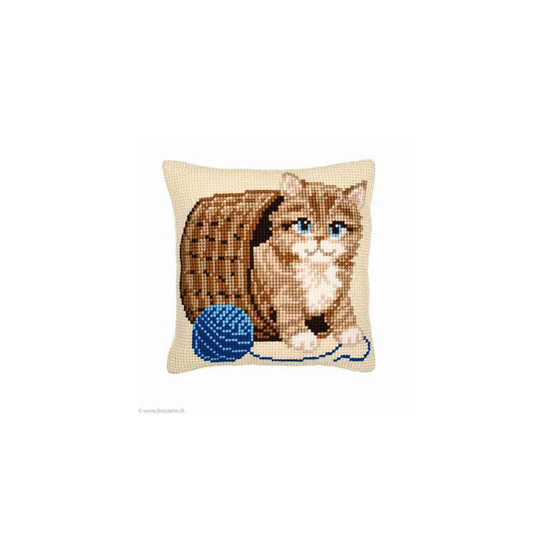Vervaco, kit coussin chat et pelote de laine (art. PN0008534). Dimensions: 40 x 40 cm. Points utilisés: point de croix. Canevas peint 1,8 croix/cm, le fond n'est pas fourni pour le montage, n'est pas vendu hors de Suisse, dans la même série PN0163860.