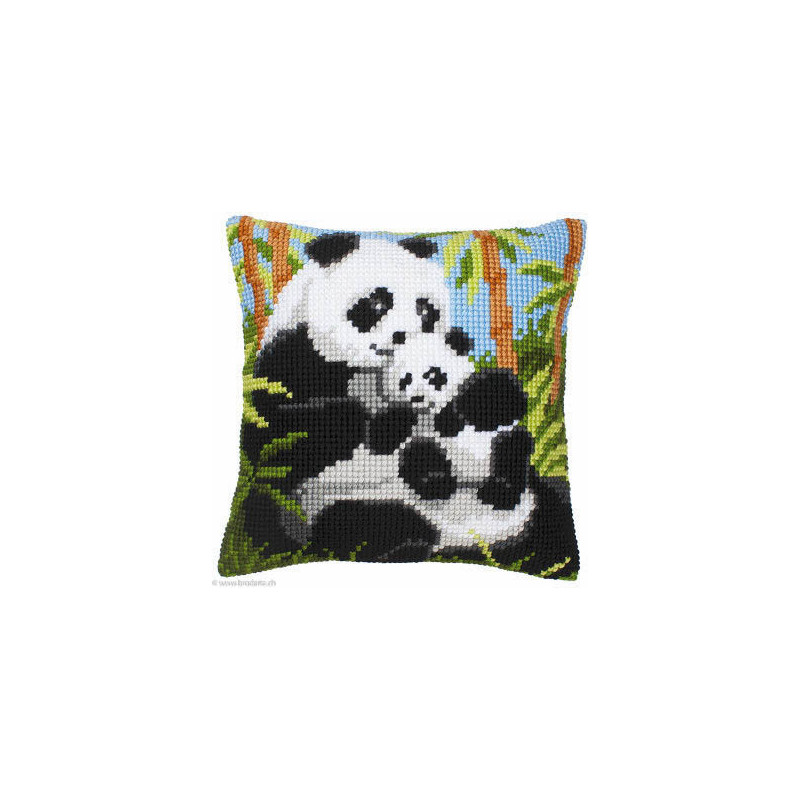 Vervaco, kit coussin Famille de pandas (art. PN0008513). Dimensions: 40 x 40 cm. Points utilisés: point de croix. Canevas peint 1,8 croix/cm, le fond n'est pas fourni pour le montage, n'est pas vendu hors de Suisse.
