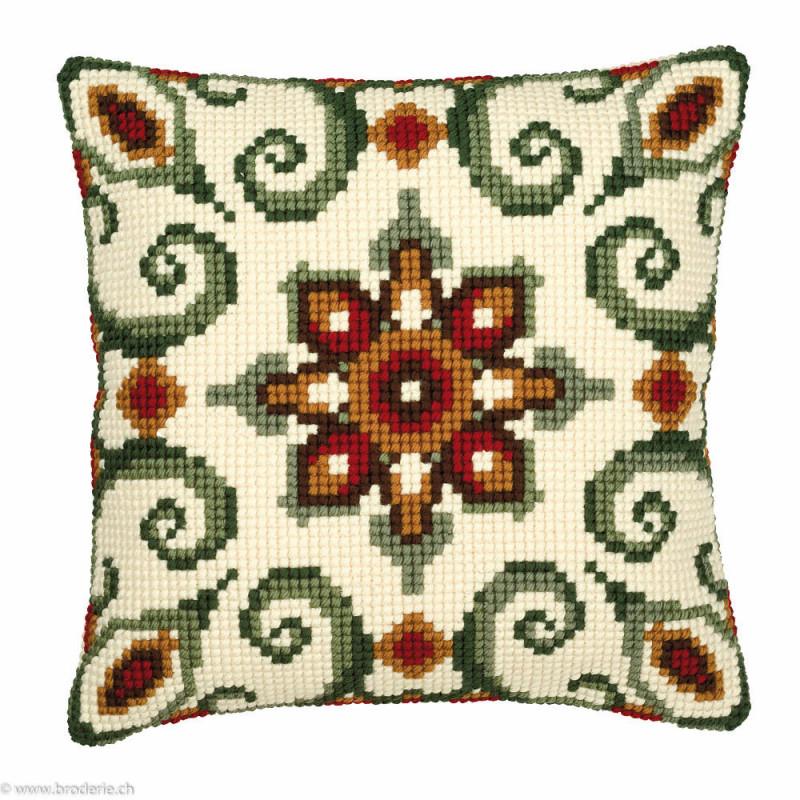Vervaco, kit coussin Géométrique (art. PN0008595). Dimensions: 40 x 40 cm. Points utilisés: point de croix. Canevas peint 1,8 croix/cm, le fond n'est pas fourni pour le montage, n'est pas vendu hors de Suisse, dans la même série PN0008594, PN0008583, PN008593.