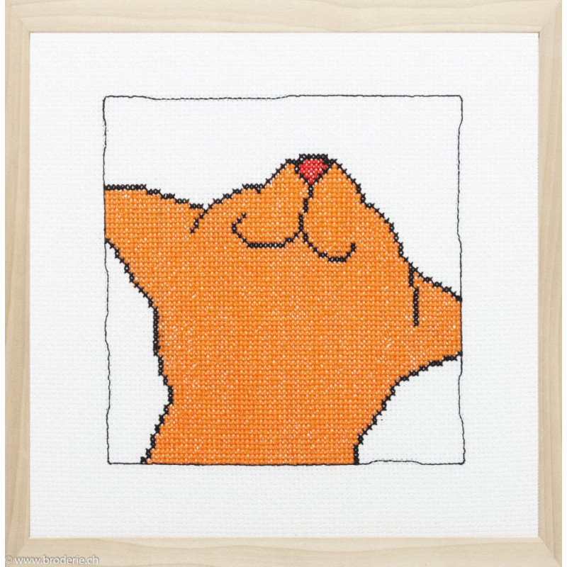 Pako, kit naissance Dikkie Dik, Jet Boeke le chat tête en haut (art. PA272.022). Dimensions: 20 x 20 cm. Trame: Aïda 5.5 pts/cm ivoire. Dans la même série PA272...et Dikkie Dik.