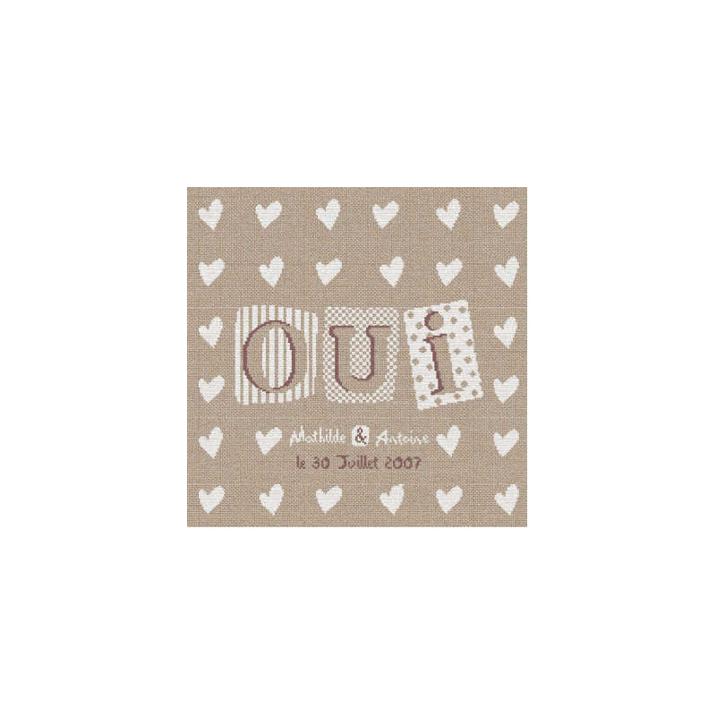 L'article 'LiliPoints, Grille Mariage - OUI (M004)' fait partie de notre assortiment depuis le 14 avril 2008. LiliPoints nous propose une très jolie gamme moderne de points de croix comptés, faciles à réaliser sur des thèmes toujours actuels - mariages- naissance - fêtes - Noël. Détail important: la créatrice nous conseille souvent dans ces fiches de réaliser la broderie 1 fil sur 1 fil lorsque les modèles ont plus de 150 points de large ou de haut. A vous de choisir ainsi la taille du résultat car en utilisant la trame standard 5.5 points/cm, les broderies sont parfois un peu grandes pour les monter en cadre, et alors nous conseillons de les monter sur un coussin (lorsqu'ils s'agit notamment de broderie à thème - amitié - mariage). Fiche technique : points de croix - peu de teintes utilisées dans les cotons - peu de points arrières. Les accessoires proposés sont souvent compris avec la fiche (coeurs en nacre - boutons).