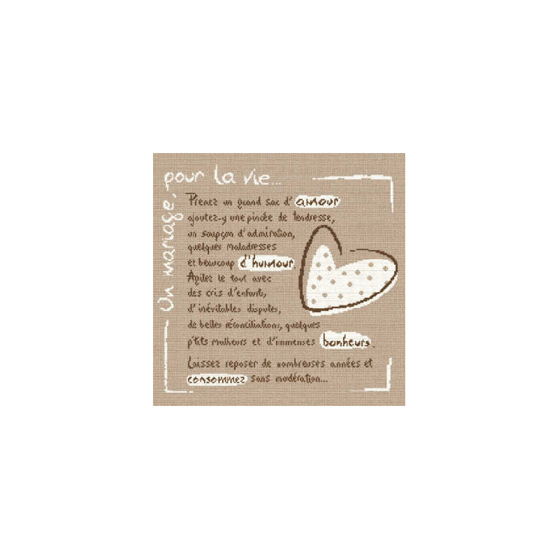 L'article 'LiliPoints, Grille Mariages, cérémonies - La recette du mariage (M003)' fait partie de notre assortiment depuis le 14 avril 2008. LiliPoints nous propose une très jolie gamme moderne de points de croix comptés, faciles à réaliser sur des thèmes toujours actuels - mariages- naissance - fêtes - Noël. Détail important: la créatrice nous conseille souvent dans ces fiches de réaliser la broderie 1 fil sur 1 fil lorsque les modèles ont plus de 150 points de large ou de haut. A vous de choisir ainsi la taille du résultat car en utilisant la trame standard 5.5 points/cm, les broderies sont parfois un peu grandes pour les monter en cadre, et alors nous conseillons de les monter sur un coussin (lorsqu'ils s'agit notamment de broderie à thème - amitié - mariage). Fiche technique : points de croix - peu de teintes utilisées dans les cotons - peu de points arrières. Les accessoires proposés sont souvent compris avec la fiche (coeurs en nacre - boutons).