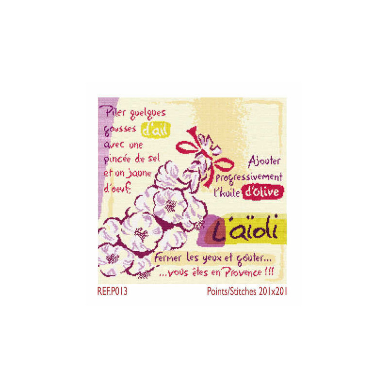 L'article 'LiliPoints, Grille Provence - L'aïoli (P013)' fait partie de notre assortiment depuis le 14 avril 2008. LiliPoints nous propose une très jolie gamme moderne de points de croix comptés, faciles à réaliser sur des thèmes toujours actuels - mariages- naissance - fêtes - Noël. Détail important: la créatrice nous conseille souvent dans ces fiches de réaliser la broderie 1 fil sur 1 fil lorsque les modèles ont plus de 150 points de large ou de haut. A vous de choisir ainsi la taille du résultat car en utilisant la trame standard 5.5 points/cm, les broderies sont parfois un peu grandes pour les monter en cadre, et alors nous conseillons de les monter sur un coussin (lorsqu'ils s'agit notamment de broderie à thème - amitié - mariage). Fiche technique : points de croix - peu de teintes utilisées dans les cotons - peu de points arrières. Les accessoires proposés sont souvent compris avec la fiche (coeurs en nacre - boutons).