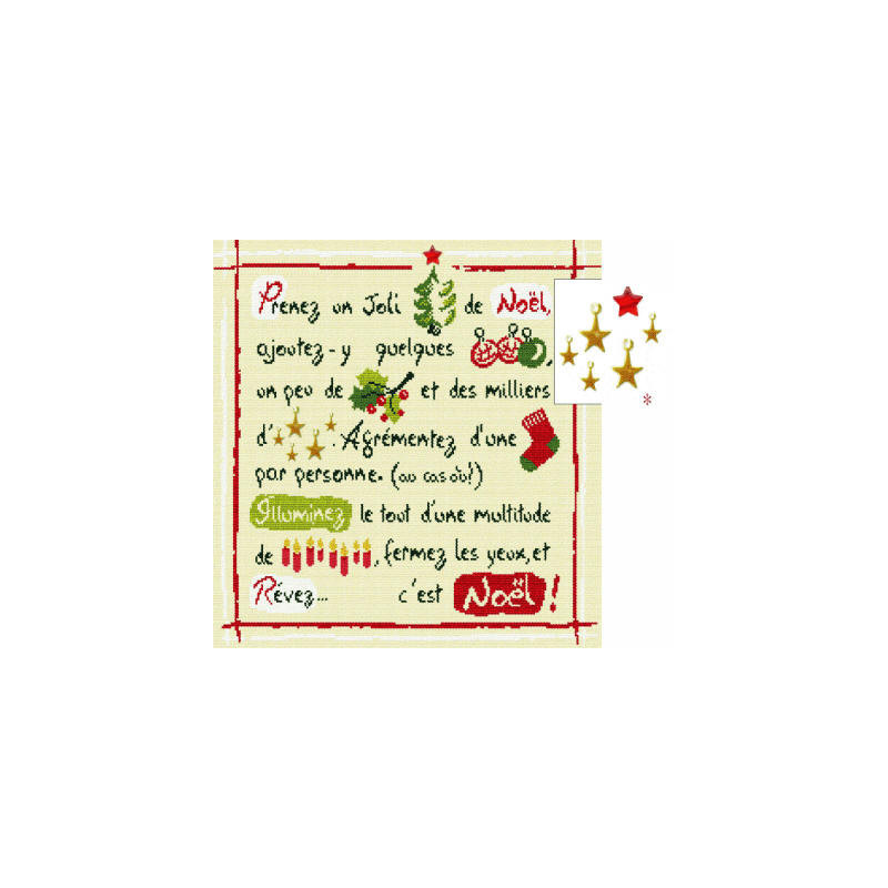 L'article 'LiliPoints, Grille Recette de Noël (N013)' fait partie de notre assortiment depuis le 7 mai 2008. LiliPoints nous propose une très jolie gamme moderne de points de croix comptés, faciles à réaliser sur des thèmes toujours actuels - mariages- naissance - fêtes - Noël. Détail important: la créatrice nous conseille souvent dans ces fiches de réaliser la broderie 1 fil sur 1 fil lorsque les modèles ont plus de 150 points de large ou de haut. A vous de choisir ainsi la taille du résultat car en utilisant la trame standard 5.5 points/cm, les broderies sont parfois un peu grandes pour les monter en cadre, et alors nous conseillons de les monter sur un coussin (lorsqu'ils s'agit notamment de broderie à thème - amitié - mariage). Fiche technique : points de croix - peu de teintes utilisées dans les cotons - peu de points arrières. Les accessoires proposés sont souvent compris avec la fiche (coeurs en nacre - boutons).