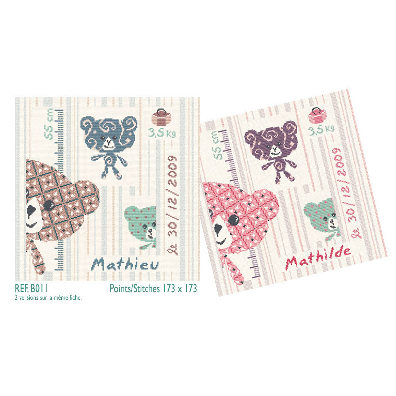 L'article 'LiliPoints, Grille Naissance ours (B011)' fait partie de notre assortiment depuis le 28 mars 2009. LiliPoints nous propose une très jolie gamme moderne de points de croix comptés, faciles à réaliser sur des thèmes toujours actuels - mariages- naissance - fêtes - Noël. Détail important: la créatrice nous conseille souvent dans ces fiches de réaliser la broderie 1 fil sur 1 fil lorsque les modèles ont plus de 150 points de large ou de haut. A vous de choisir ainsi la taille du résultat car en utilisant la trame standard 5.5 points/cm, les broderies sont parfois un peu grandes pour les monter en cadre, et alors nous conseillons de les monter sur un coussin (lorsqu'ils s'agit notamment de broderie à thème - amitié - mariage). Fiche technique : points de croix - peu de teintes utilisées dans les cotons - peu de points arrières. Les accessoires proposés sont souvent compris avec la fiche (coeurs en nacre - boutons).