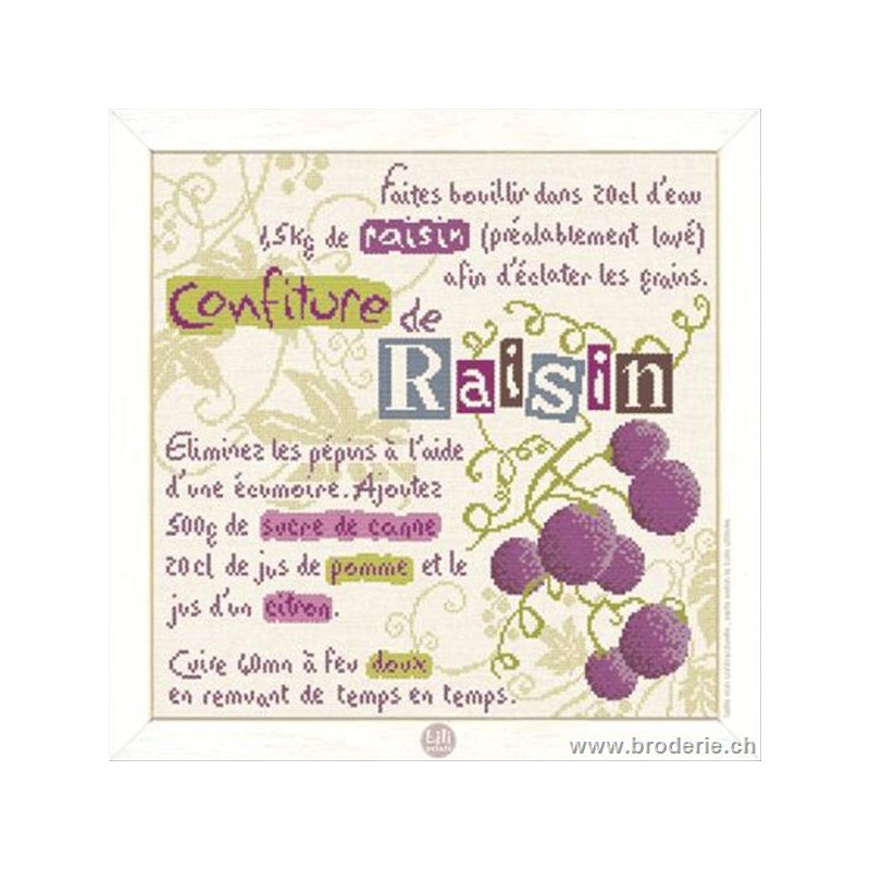 L'article 'LiliPoints, Grille Gourmandise - Confiture de Raisin (G014)' fait partie de notre assortiment depuis le 23 septembre 2009. LiliPoints nous propose une très jolie gamme moderne de points de croix comptés, faciles à réaliser sur des thèmes toujours actuels - mariages- naissance - fêtes - Noël. Détail important: la créatrice nous conseille souvent dans ces fiches de réaliser la broderie 1 fil sur 1 fil lorsque les modèles ont plus de 150 points de large ou de haut. A vous de choisir ainsi la taille du résultat car en utilisant la trame standard 5.5 points/cm, les broderies sont parfois un peu grandes pour les monter en cadre, et alors nous conseillons de les monter sur un coussin (lorsqu'ils s'agit notamment de broderie à thème - amitié - mariage). Fiche technique : points de croix - peu de teintes utilisées dans les cotons - peu de points arrières. Les accessoires proposés sont souvent compris avec la fiche (coeurs en nacre - boutons).