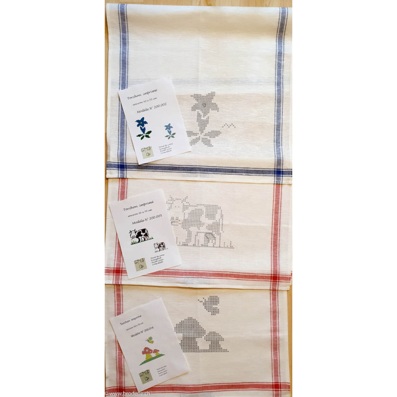 CL-Broderie, linge de cuisine imprimé gentianes (art. 200.002). Dimensions: 50 x 70 cm. Linge mi coton mi lin. Le coloris du linge pour la bordure peut être d'une autre couleur que sur l'image, mais on ne peut pas choisir, se renseigner si jamais sur ce qui est de stock. Autres linges sous référencs 200.0 et numéro. Sans coton mouliné. En haut sur la photo.