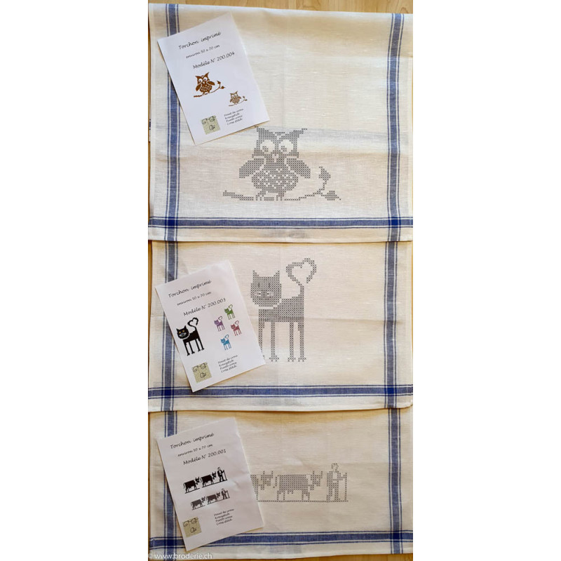 CL-Broderie, linge de cuisine imprimé chat (art. 200.003). Dimensions: 50 x 70 cm. Points utilisés: point de croix. Linge mi coton mi lin. Le coloris du linge pour la bordure peut être d'une autre couleur que sur l'image, mais on ne peut pas choisir, se renseigner si jamais sur ce qui est de stock. Autres linges sous référencs 200.0 et numéro. Sans coton mouliné. Au milieu sur la photo.