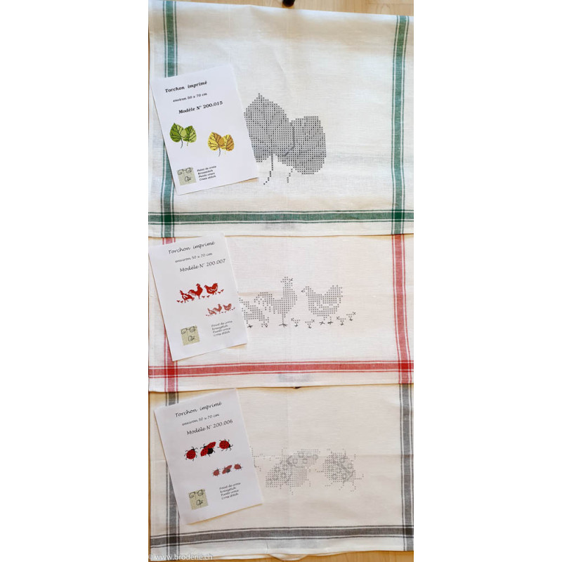 CL-Broderie, linge de cuisine imprimé poules (art. 200.007). Dimensions: 50 x 70 cm. Linge mi coton mi lin. Le coloris du linge pour la bordure peut être d'une autre couleur que sur l'image, mais on ne peut pas choisir, se renseigner si jamais sur ce qui est de stock. Autres linges sous référencs 200.0 et numéro. Sans coton mouliné. Au milieu sur la photo.