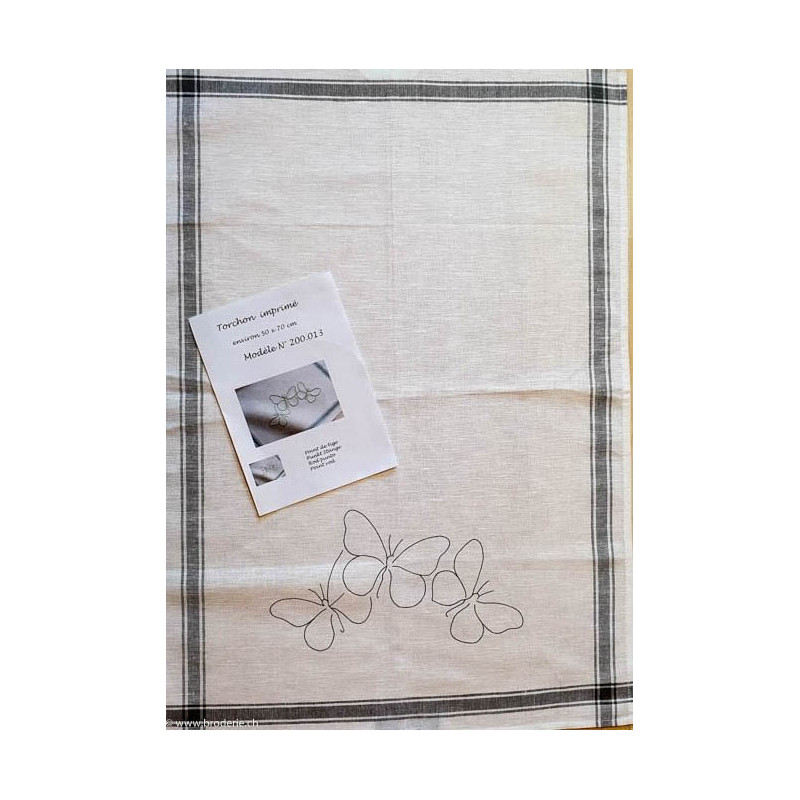 CL-Broderie, linge de cuisine imprimé papillons (art. 200.013). Dimensions: 50 x 70 cm. Points utilisés: point de piqûre. Linge mi coton mi lin. Le coloris du linge pour la bordure peut être d'une autre couleur que sur l'image, mais on ne peut pas choisir, se renseigner si jamais sur ce qui est de stock. Autres linges sous référencs 200.0 et numéro. Sans coton mouliné.