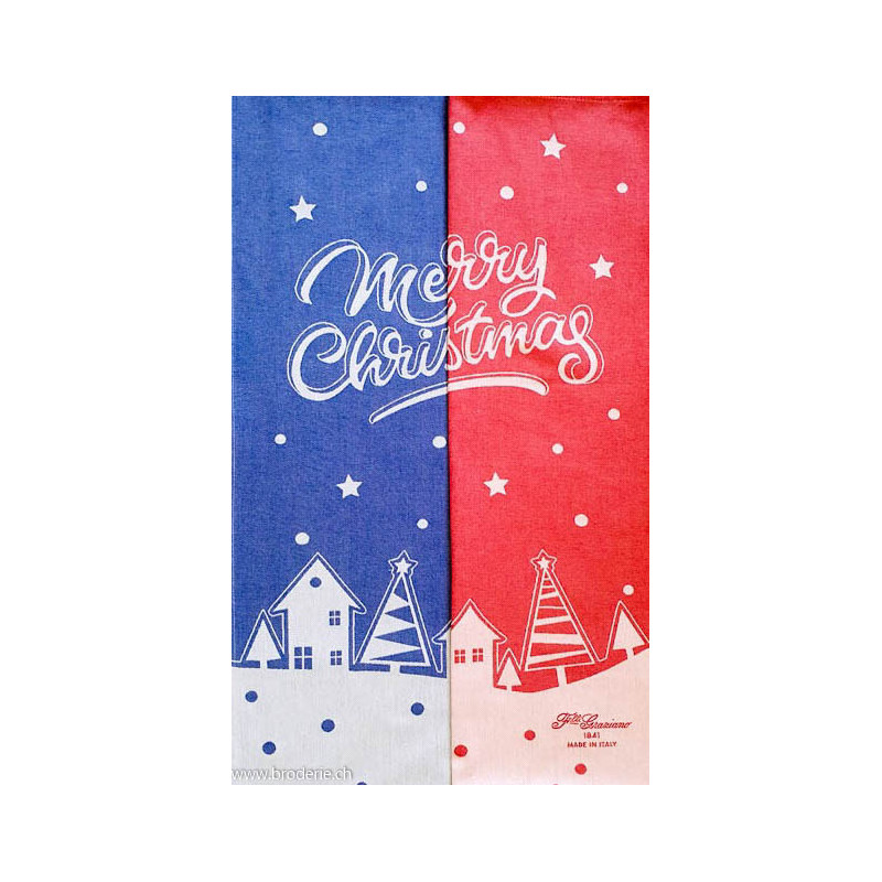 Graziano, Linge de cuisine imprimé Joyeux Noël, rouge (art. CU6195). Dimensions: 45 x 70 cm. Linge de cuisine, 100% coton. Ce qui se brode est le contour des lettres et aussi le tour des maisons (ligne dessinée qui couvre le motif), en surpiquage sur la ligne, avec au choix point de tige, point arrière, ou point de bouclette. Dmc correspondant rouge.