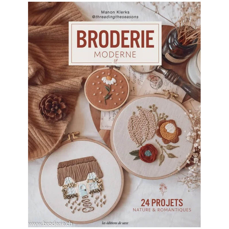 Editions de Saxe, Livre broderie moderne (art. MLDI410). Livre de 175 pages, créations de Manon Klerks, avec24 projets tendance avec la nature comme source d’inspiration. La préconisation de l’auteure concernant les fils moulinés : brodez (souvent) avec 6 brins pour créer de beaux reliefs ! Avec motifs à transférer.