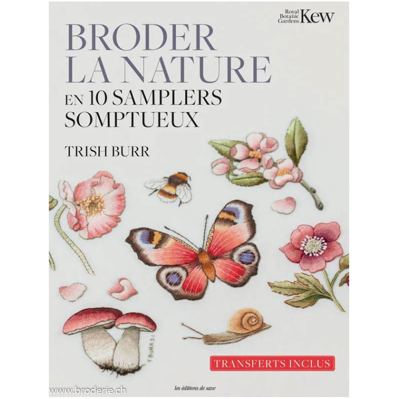Editions de Saxe, Livre Broder la nature (art. MLDI408). Points utilisés: broderie créative. Livre de 180 pages avec transferts, avec de superbes motifs à broder en broderie créative, de Trish Burr en association avec les jardins Botaniques toyaux de Kew.tous les points sont bien expliqués avec photos à l'appui.