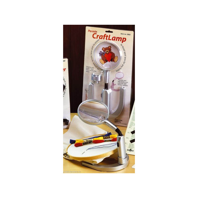 Permin, loupe à poser sur table, avec petite lampe (art. PE5882). Pratique pour emporter, mais cela va bien pour dépanner, la lampe n'est pas très puissante pour compter l'utiliser tout le temps :-).