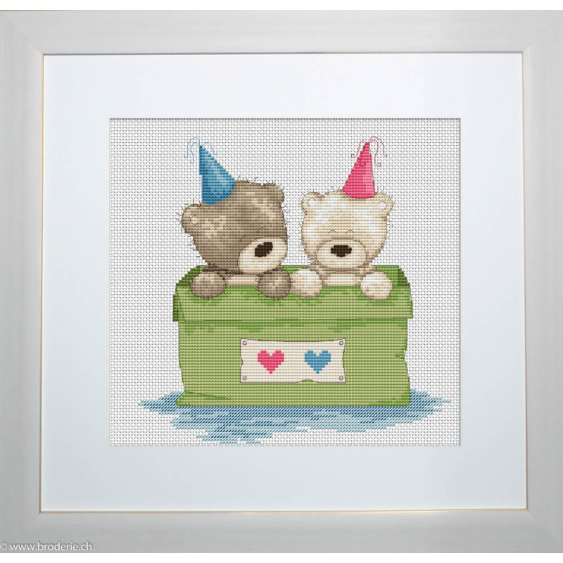 L'article 'Luca-S, kit Teddy Bruno et Bianca, Surprise (LUCAB1012)' fait partie de notre assortiment depuis le 29 septembre 2018. Luca-S est une gamme de points de croix comptés qui nous vient de Moldavie. Il y a beaucoup de modèles de personnages, paysages, nature morte, ainsi que de sympathiques kits pour Noël, des sacs à confectionner, des carttes postales à broder. Pour beaucoup de modèle vous pouvez aussi avoir le kit en canevas 25ct, pour des demi-points à compter (10/cm), ce qui fait la broderie bien plus petite et fine dans la rubrique Kits - Luca-S (P). Les kits sont fournis principalement sur de la trame aïda 6.4 points/cm ou 7 points/cm, ou de l'étamine de Zweigart, les coussins avec de l'étamine 8 fils ou 10 fils/cm. Les fils sont de la maison Anchor.