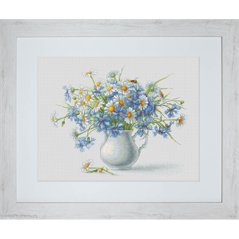 L'article 'Luca-S, kit Cornflowers and camomiles (LUCAB2275)' fait partie de notre assortiment depuis le 4 octobre 2018. Luca-S est une gamme de points de croix comptés qui nous vient de Moldavie. Il y a beaucoup de modèles de personnages, paysages, nature morte, ainsi que de sympathiques kits pour Noël, des sacs à confectionner, des carttes postales à broder. Pour beaucoup de modèle vous pouvez aussi avoir le kit en canevas 25ct, pour des demi-points à compter (10/cm), ce qui fait la broderie bien plus petite et fine dans la rubrique Kits - Luca-S (P). Les kits sont fournis principalement sur de la trame aïda 6.4 points/cm ou 7 points/cm, ou de l'étamine de Zweigart, les coussins avec de l'étamine 8 fils ou 10 fils/cm. Les fils sont de la maison Anchor.