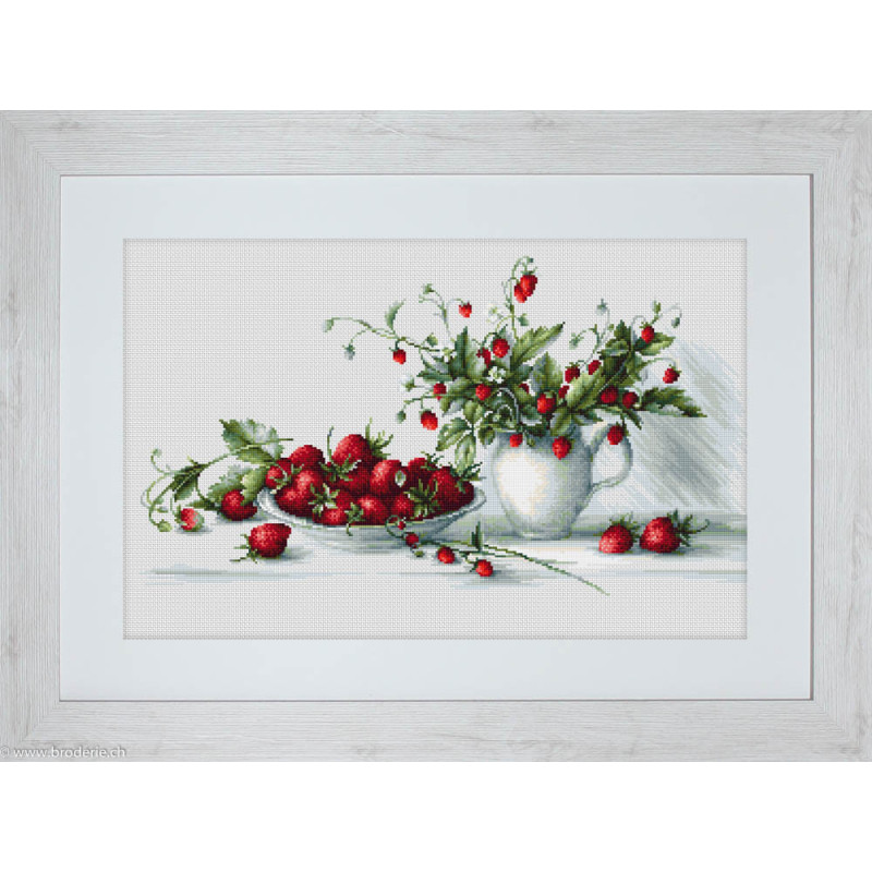 L'article 'Luca-S, kit Strawberries (LUCAB2277)' fait partie de notre assortiment depuis le 4 octobre 2018. Luca-S est une gamme de points de croix comptés qui nous vient de Moldavie. Il y a beaucoup de modèles de personnages, paysages, nature morte, ainsi que de sympathiques kits pour Noël, des sacs à confectionner, des carttes postales à broder. Pour beaucoup de modèle vous pouvez aussi avoir le kit en canevas 25ct, pour des demi-points à compter (10/cm), ce qui fait la broderie bien plus petite et fine dans la rubrique Kits - Luca-S (P). Les kits sont fournis principalement sur de la trame aïda 6.4 points/cm ou 7 points/cm, ou de l'étamine de Zweigart, les coussins avec de l'étamine 8 fils ou 10 fils/cm. Les fils sont de la maison Anchor.